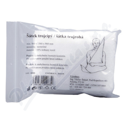 Šátek trojcípý z netkaného textilu. Rozměr 960x1360x960 mm. Zabalen v PE obalu, uzavřeno na zip. Měl by být součástí vybavení každé lékárničky, vhodný pro první pomoc, pro znehybnění horní končetiny.