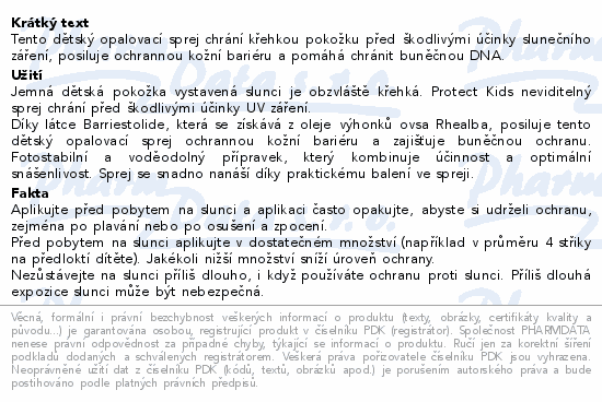 Tento dětský opalovací sprej chrání křehkou pokožku před škodlivými účinky slunečního záření, posiluje ochrannou kožní bariéru a pomáhá chránit buněčnou DNA.