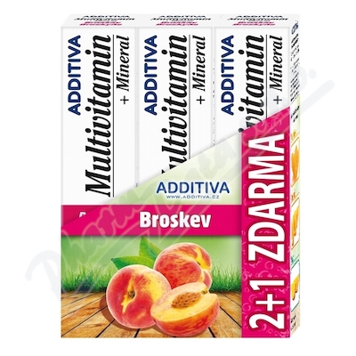 Additiva akční balení 2+1 je multivitaminová směs z 10ti navzájem se doplňujících vitaminů, obohacená o 3 základní minerály. S příchutí broskve.