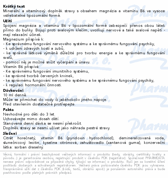 Minerální a vitamínový doplněk stravy s obsahem magnézia a vitamínu B6 ve vysoce vstřebatelné lipozomální formě.