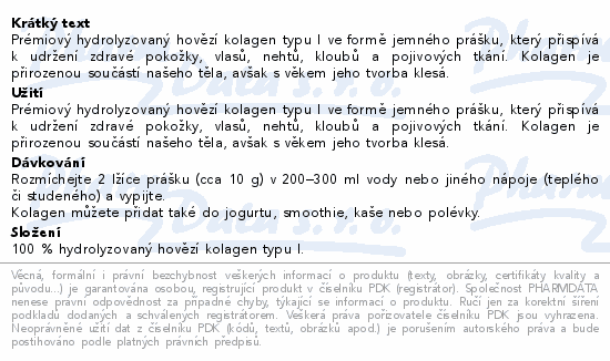 Prémiový hydrolyzovaný hovězí kolagen typu I ve formě jemného prášku, který přispívá k udržení zdravé pokožky, vlasů, nehtů, kloubů a pojivových tkání. Kolagen je přirozenou součástí našeho těla, avšak s věkem jeho tvorba klesá.