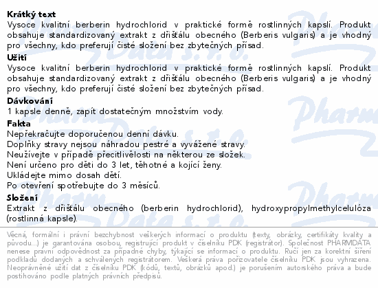 Vysoce kvalitní berberin hydrochlorid v praktické formě rostlinných kapslí. Produkt obsahuje standardizovaný extrakt z dřišťálu obecného (Berberis vulgaris) a je vhodný pro všechny, kdo preferují čisté složení bez zbytečných přísad.