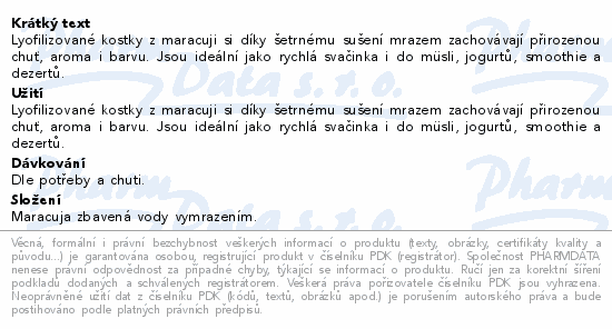 Lyofilizované kostky z maracuji si díky šetrnému sušení mrazem zachovávají přirozenou chuť, aroma i barvu. Jsou ideální jako rychlá svačinka i do müsli, jogurtů, smoothie a dezertů.