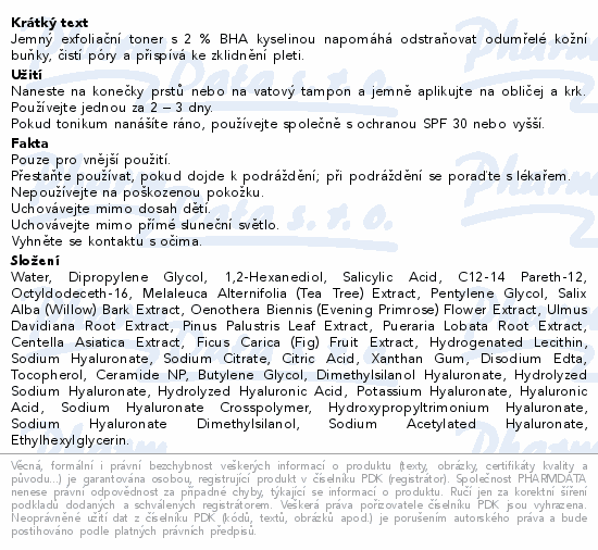 Jemný exfoliační toner s 2 % BHA kyselinou napomáhá odstraňovat odumřelé kožní buňky, čistí póry a přispívá ke zklidnění pleti.