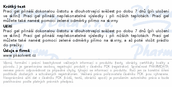 Prací gel přináší dokonalou čistotu a dlouhotrvající svěžest po dobu 7 dnů (při uložení ve skříni). Prací gel přináší nepřekonatelné výsledky i při nižších teplotách. Prací gel můžete také nanést pomocí zelené odměrky přímo na skvrny.