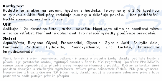Rozlučte se s akné na zádech, hýždích a hrudníku. Tělový sprej s 2 % kyselinou salicylovou a AHA čistí póry, redukuje pupínky a zklidňuje pokožku – bez podráždění. Rychlá absorpce, snadná aplikace.