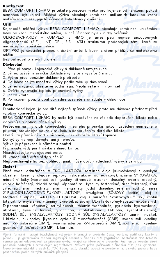 BEBA COMFORT 1 5HMO je tekuté počáteční mléko pro kojence od narození, pokud nemohou být kojeni. Mléčná výživa obsahuje kombinaci unikátních látek po vzoru mateřského mléka, jejichž účinnost byla klinicky ověřená.