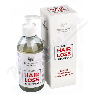 BIOAQUANOL INTENSIVE Anti HAIR LOSS shampoo. Pečující šampon proti nadměrnému vypadávání vlasů a pro posílení jejich kvality. Obsahuje kofein, keratin, kyselinu hyaluronovou, panthenol a extrakt kurkumy.