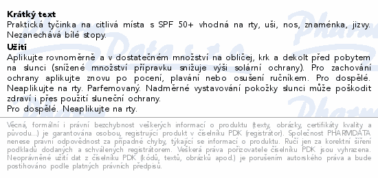 Praktická tyčinka na citlivá místa s SPF 50+ vhodná na rty, uši, nos, znaménka, jizvy. Nezanechává bílé stopy.