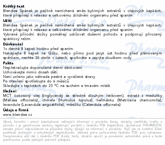 Blendea Spánek je pečlivě namíchaná směs bylinných extraktů v olejových kapkách, které přispívají k relaxaci a celkovému zklidnění organismu před spaním.