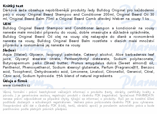 Dárková sada obsahuje nejoblíbenější produkty řady Bulldog Original pro každodenní péči o vousy: Original Beard Shampoo and Conditioner 200ml, Original Beard Oil 30 ml, Original Beard Balm 75ml a Original Beard Comb dřevěný hřeben na vousy 1 ks