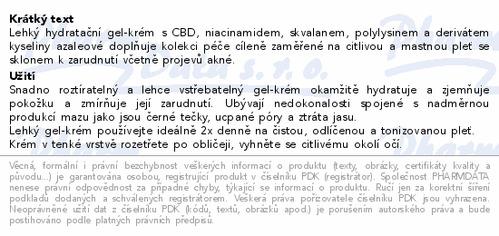 Lehký hydratační gel-krém s CBD, niacinamidem, skvalanem, polylysinem a derivátem kyseliny azaleové doplňuje kolekci péče cíleně zaměřené na citlivou a mastnou pleť se sklonem k zarudnutí včetně projevů akné.