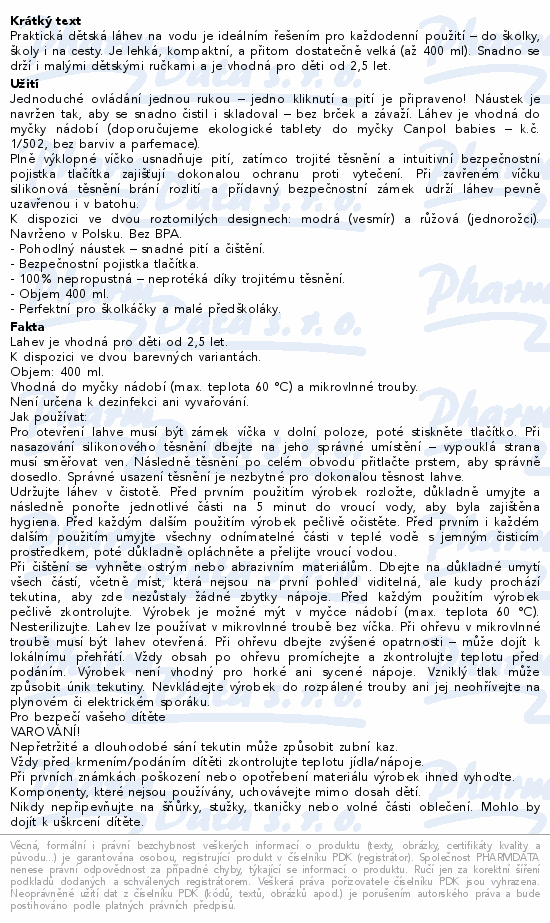 Praktická dětská láhev na vodu je ideálním řešením pro každodenní použití – do školky, školy i na cesty. Je lehká, kompaktní, a přitom dostatečně velká (až 400 ml). Snadno se drží i malými dětskými ručkami a je vhodná pro děti od 2, 5 let.