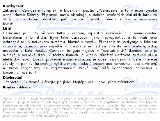 Základem Carnosine komplex je bioaktivní peptid L-Carnosine, a to v extra vysoké denní dávce 500mg. Přípravek navíc obsahuje 6 dalších ověřených aktivních látek se silným antioxidačním účinkem, jenž podporují vitalitu, činnost mozku a regeneraci buněk.