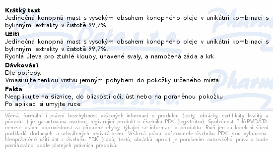 Jedinečná konopná mast s vysokým obsahem konopného oleje v unikátní kombinaci s bylinnými extrakty v čistotě 99, 7%.