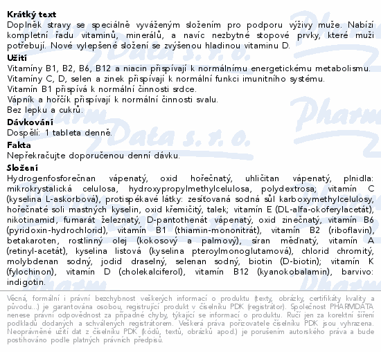 Doplněk stravy se speciálně vyváženým složením pro podporu výživy muže. Nabízí kompletní řadu vitaminů, minerálů, a navíc nezbytné stopové prvky, které muži potřebují. Nové vylepšené složení se zvýšenou hladinou vitaminu D.