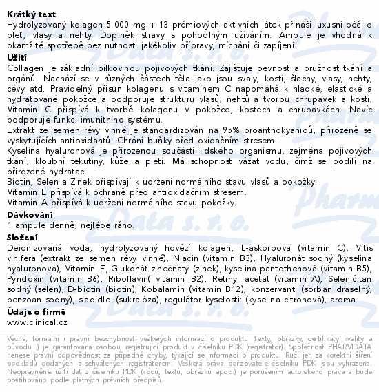 Hydrolyzovaný kolagen 5 000 mg + 13 prémiových aktivních látek přináší luxusní péči o pleť, vlasy a nehty. Doplněk stravy s pohodlným užíváním. Ampule je vhodná k okamžité spotřebě bez nutnosti jakékoliv přípravy, míchání či zapíjení.