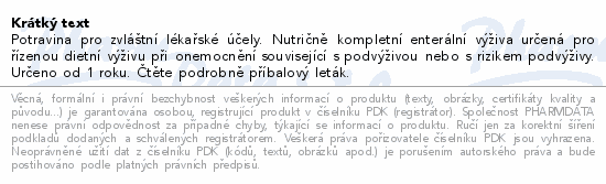 Potravina pro zvláštní lékařské účely. Nutričně kompletní enterální výživa určená pro řízenou dietní výživu při onemocnění související s podvýživou nebo s rizikem podvýživy. Určeno od 1 roku. Čtěte pozorně příbalový leták.