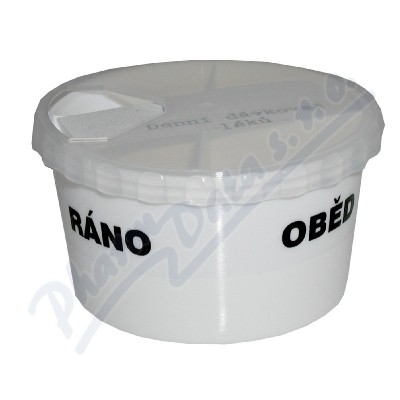 Dávkovač umožňuje rozdělení léků na celý den. Čtyři přihrádky (ráno, poledne, večer, noc) jsou velkoobjemové a hodí se i pro pacienty s větším množstvým předepsaných léčiv. Horní víko je průhledné pro snadnou kontrolu obsahu.