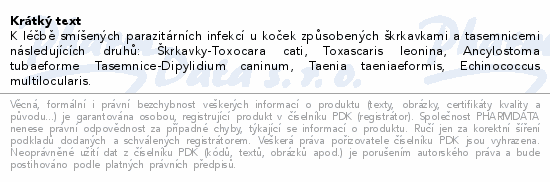 K léčbě smíšených parazitárních infekcí u koček způsobených škrkavkami a tasemnicemi následujících druhů: Škrkavky-Toxocara cati, Toxascaris leonina, Ancylostoma tubaeforme Tasemnice-Dipylidium caninum, Taenia taeniaeformis, Echinococcus multilocularis.