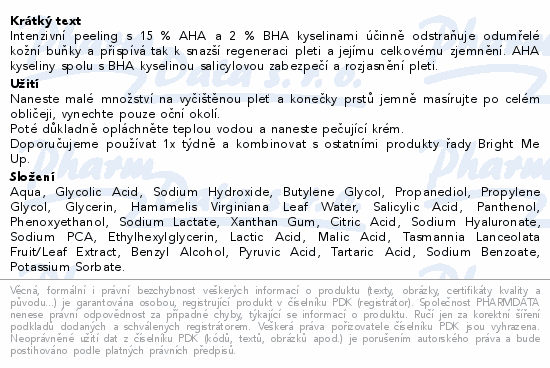 Intenzivní peeling s 15 % AHA a 2 % BHA kyselinami účinně odstraňuje odumřelé kožní buňky a přispívá tak k snazší regeneraci pleti a jejímu celkovému zjemnění. AHA kyseliny spolu s BHA kyselinou salicylovou zabezpečí a rozjasnění pleti.