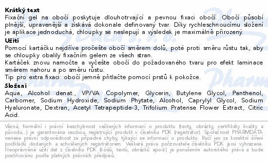 Fixační gel na obočí poskytuje dlouhotrvající a pevnou fixaci obočí. Obočí působí plnější, upravenější a získává dokonale definovaný tvar. Díky rychleschnoucímu složení je aplikace jednoduchá, chloupky se neslepují a výsledek je maximálně přirozený.