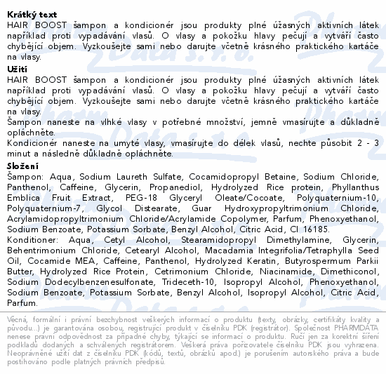 HAIR BOOST šampon a kondicionér jsou produkty plné úžasných aktivních látek například proti vypadávání vlasů. O vlasy a pokožku hlavy pečují a vytváří často chybějící objem. Vyzkoušejte sami nebo darujte včetně krásného praktického kartáče na vlasy.