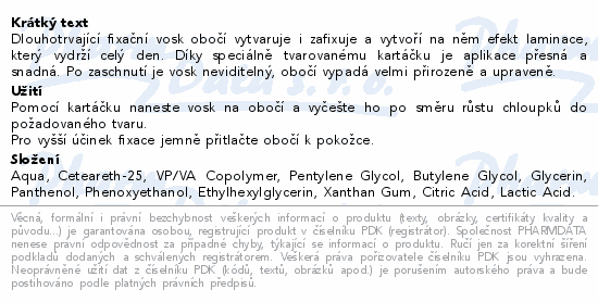 Dlouhotrvající fixační vosk obočí vytvaruje i zafixuje a vytvoří na něm efekt laminace, který vydrží celý den. Díky speciálně tvarovanému kartáčku je aplikace přesná a snadná. Po zaschnutí je vosk neviditelný, obočí vypadá velmi přirozeně a upraveně.