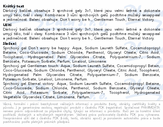 Dárkový balíček obsahuje 3 sprchové gely 3v1, které jsou velmi šetrné a dokonale umyjí tělo, tvář i vlasy. Kombinace 3 vůní sprchových gelů podtrhne mužský sexappeal a jedinečnost. Balení obsahuje: Don´t worry be h., Gentleman Touch, Eternal Victory.
