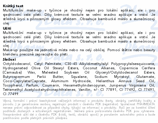 Multifunkční make-up v tyčince je vhodný nejen pro lokální aplikaci, ale i pro sjednocení celé pleti. Díky krémové textuře se velmi snadno aplikuje a vrství. Je středně krycí s přirozeným glowy efektem. Obsahuje bambucké máslo a slunečnicový olej.