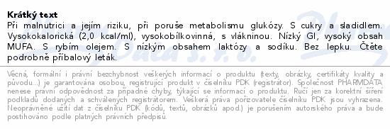Při malnutrici a jejím riziku, při poruše metabolismu glukózy. S cukry a sladidlem. Vysokokalorická (2, 0 kcal