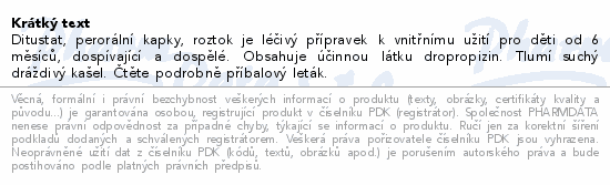 Ditustat, perorální kapky, roztok je léčivý přípravek k vnitřnímu užití pro děti od 6 měsíců, dospívající a dospělé. Obsahuje účinnou látku dropropizin. Tlumí suchý dráždivý kašel. Čtěte pozorně příbalový leták.