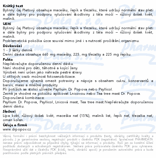 Bylinný čaj Pleťový obsahuje macešku, řepík a třezalku, které udržují normální stav pleti a dále byliny pro podporu vylučování škodliviny z těla močí – růžový ibišek květ, maliník.