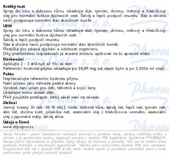 Spray do krku s dubovou kůrou obsahuje dub, tymián, diviznu, mátový a hřebíčkový olej pro normální funkce dýchacích cest. Šalvěj a řepík podpoří imunitu. Sléz a divizna navíc podporuje normální stav slizničních buněk.