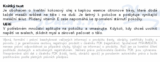 Je obohacen o kvalitní kokosový olej s kapkou esence citronové trávy, která dodá každé masáži svěžest na těle i na duši. Je šetrný k pokožce a poskytuje vynikající masážní skluz. Přidaný vitamín E zase napomáhá ke zpomalení stárnutí pokožky.