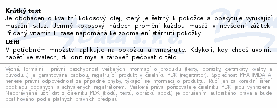 Je obohacen o kvalitní kokosový olej, který je šetrný k pokožce a poskytuje vynikající masážní skluz. Jemný kokosový nádech promění každou masáž v nevšední zážitek. Přidaný vitamín E zase napomáhá ke zpomalení stárnutí pokožky.