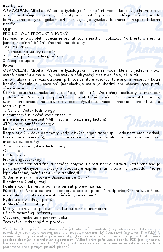 OSMOCLEAN Micellar Water je fyziologická micelární voda, která v jednom kroku šetrně odstraňuje make-up, nečistoty a přebytečný maz z obličeje, očí a rtů. Je formulována ve fyziologickém pH, což zajišťuje vysokou toleranci a respekt k kožní bariéře.