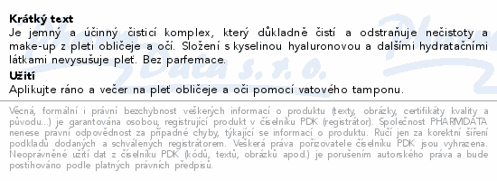 Je jemný a účinný čisticí komplex, který důkladně čistí a odstraňuje nečistoty a make-up z pleti obličeje a očí. Složení s kyselinou hyaluronovou a dalšími hydratačními látkami nevysušuje pleť. Bez parfemace.