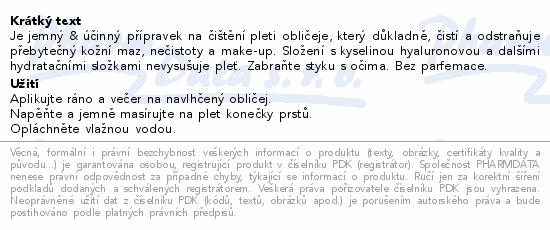 Je jemný & účinný přípravek na čištění pleti obličeje, který důkladně, čistí a odstraňuje přebytečný kožní maz, nečistoty a make-up. Složení s kyselinou hyaluronovou a dalšími hydratačními složkami nevysušuje pleť. Zabraňte styku s očima. Bez parfemace.