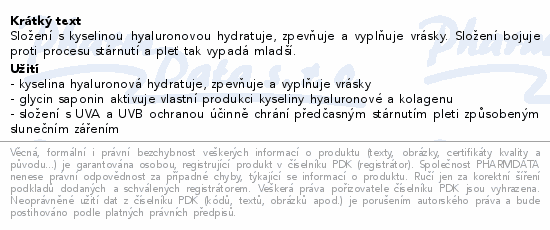 Složení s kyselinou hyaluronovou hydratuje, zpevňuje a vyplňuje vrásky. Složení bojuje proti procesu stárnutí a pleť tak vypadá mladší.