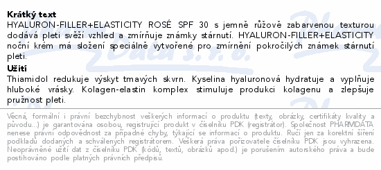 HYALURON-FILLER+ELASTICITY ROSÉ SPF 30 s jemně růžově zabarvenou texturou dodává pleti svěží vzhled a zmírňuje známky stárnutí. HYALURON-FILLER+ELASTICITY noční krém má složení speciálně vytvořené pro zmírnění pokročilých známek stárnutí pleti.