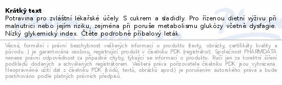 Potravina pro zvláštní lékařské účely. S cukrem a sladidly. Pro řízenou dietní výživu při malnutrici nebo jejím riziku, zejména při poruše metabolismu glukózy včetně dysfagie. Nízký glykemický index. Čtěte pozorně příbalový leták.