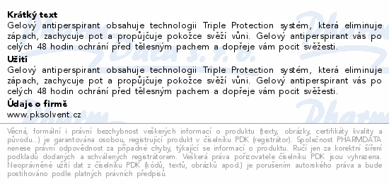Gelový antiperspirant obsahuje technologii Triple Protection systém, která eliminuje zápach, zachycuje pot a propůjčuje pokožce svěží vůni. Gelový antiperspirant vás po celých 48 hodin ochrání před tělesným pachem a dopřeje vám pocit svěžesti.