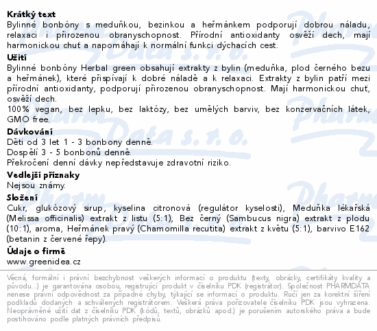 Bylinné bonbóny s meduňkou, bezinkou a heřmánkem podporují dobrou náladu, relaxaci i přirozenou obranyschopnost. Přírodní antioxidanty osvěží dech, mají harmonickou chuť a napomáhají k normální funkci dýchacích cest.