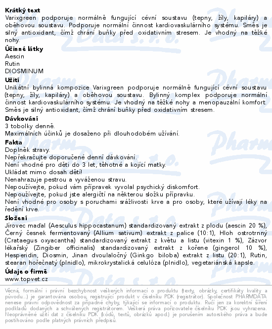 Varixgreen podporuje normálně fungující cévní soustavu (tepny, žíly, kapiláry) a oběhovou soustavu. Podporuje normální činnost kardiovaskulárního systému. Směs je silný antioxidant, čímž chrání buňky před oxidativním stresem. Je vhodný na těžké nohy.