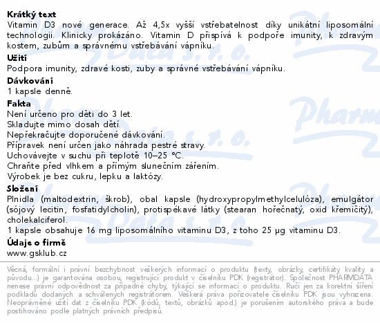 Vitamin D3 nové generace. Až 4, 5x vyšší vstřebatelnost díky unikátní liposomální technologii. Klinicky prokázáno. Vitamin D přispívá k podpoře imunity, k zdravým kostem, zubům a správnému vstřebávání vápníku.