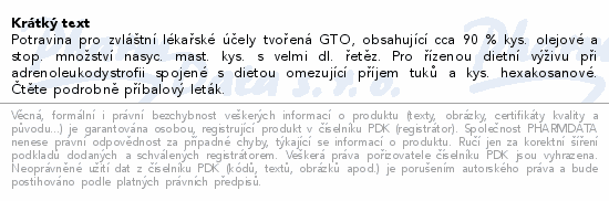 Potravina pro zvláštní lékařské účely tvořená GTO, obsahující cca 90 % kys. olejové a stop. množství nasyc. mast. kys. s velmi dl. řetěz. Pro řízenou dietní výživu při adrenoleukodystrofii spojené s dietou omezující příjem tuků a kys. hexakosanové. Čtěte pozorně příbalový leták.