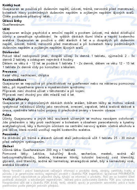 Guajacuran se používá při duševním napětí, úzkosti, trémě, nervozitě před menstruací, bolestech hlavy podmíněných duševním napětím a zvýšeným napětím šíjových svalů. Čtěte pozorně příbalový leták.
