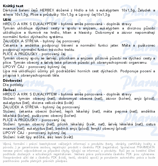 Dárkové balení čajů HERBEX složené z Hrdlo a krk s eukalyptem 10x1, 5g, Žaludek a střeva 10x1, 5g, Plíce a průdušky 10x1, 5g a Lipový čaj10x1, 5g.