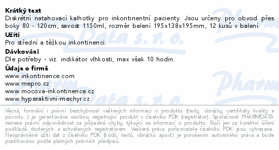Diskrétní natahovací kalhotky pro inkontinentní pacienty. Jsou určeny pro obvod přes boky 80 - 120cm, savost 1150ml, rozměr balení 195x138x195mm, 12 kusů v balení.